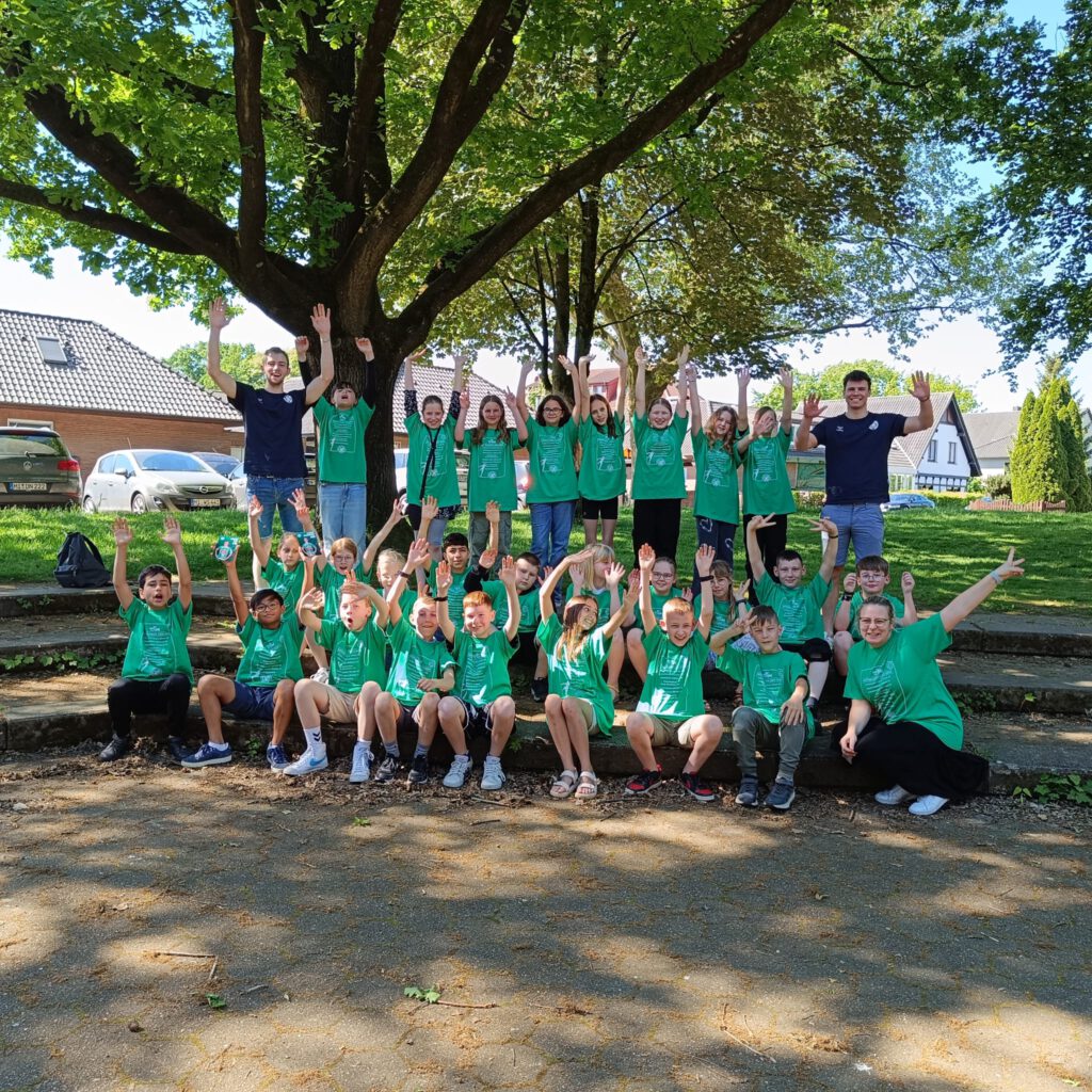 Als Dank für den Besuch der beiden Spieler erhielten die Schülerinnen und Schüler sogar Fanshirts, die sie stolz tragen werden. Die Begeisterung der Klasse für den Handball und den Verein GWD Minden ist deutlich spürbar.