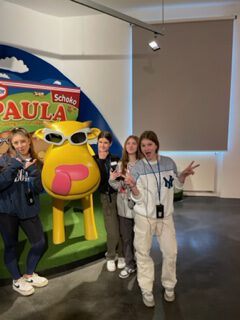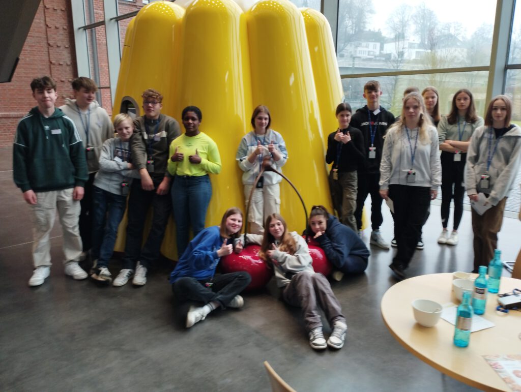 Am 23.02. gegen 8.00 Uhr ging es mit unseren Lehrerinnen Frau Lüling und Frau Bagehorn per Bus aus Hüllhorst zum Bahnhof Löhne und mit dem Zug weiter nach Bielefeld. In Bielefeld angekommen, fuhren wir noch ein paar Minuten mit der Stadtbahn zu Dr. Oetker. In der großen Eingangshalle wurden wir herzlich willkommen geheißen. Wir legten unsere Sachen ab, uns wurden noch einige Dinge erklärt und dann konnte es auch schon losgehen. Der Rundgang begann damit, dass wir über die Gründer und Nachfolger von Dr. Oetker und die Geschichte des Unternehmens informiert wurden. Nach kurzen Einblicken in die Arbeitsfelder verschiedener Mitarbeiter machten wir eine kleine Pause am großen Pudding-Automaten. Dort konnte man selbst zubereiteten Vanillepudding essen sowie verschiedene Sorten Müsli probieren. Nach der Pause ging es in das zweite Stockwerk in die Dr. Oetker Versuchsküche. Man bekam einen kleinen Einblick darin, wie Lebensmittel getestet und zubereitet werden sowie auch neue Rezepte erstellt werden. Im dritten Stock konnten Kochbücher sowie Fahrzeuge aus der Geschichte des Unternehmens bewundert werden. Es gab eine Rezeptwiese, dort konnte man verschiedene Rezepte mitnehmen. Am Ende gab es eine große Verkostung von Pizza und Kuchen. Dann war es Zeit, wieder zurückzufahren. Mit einer Tüte voller Informationen und einer Backmischung fuhren wir mit der Stadtbahn zurück zum Hauptbahnhof, von dort zum Löhner Bahnhof und dann zurück zur Schule. Es war ein sehr spannender, lustiger und informationsreicher Tag!
