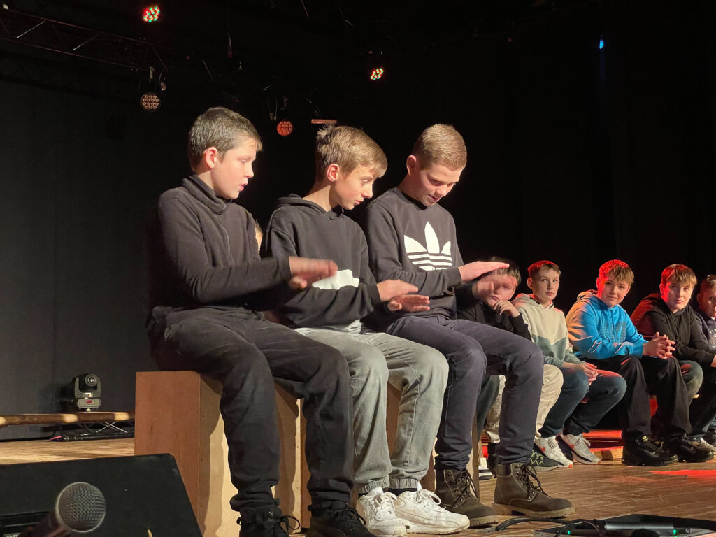 Nach der Unterbrechung erwartete die verblüfften Zuschauer im Café ,,Zum schwarzen Loch“, Treffpunkt der berühmtesten Physiker und Chemiker aller Zeiten, eine beeindruckende Show, in der Marie Kleine (10e) als Marie Curie, Michel Meierjohann (10e) als Albert Einstein und Torin Kneip (10b) als Alfred Nobel mehrere naturwissenschaftliche Experimente durchführten. Einen bunten Blumenstrauß an weiteren musikalischen Beiträgen präsentierten Justin Diekmann (7f) am Klavier, eine Schülergruppe aus den Jahrgängen 5, 6 und 7, die mit einem großen Aufgebot an Orff-Instrumenten für klangvolle Momente sorgte, als auch der Musikkurs der EF, der den Titel ,,Wilson, I’m sorry“ aus dem Film ,,Cast Away“ spielte. Der Auftritt der Schülerinnen und Schüler aus der Klasse 7b stellte kraftvoll unter Beweis, dass man mit dem Körper Klänge und Rhythmen erzeugen und ganze Musikstücke entwickeln kann. Auf kraftvolle Worte setzten die Teilnehmerinnen der AG ,,Selbstbehauptung für Mädchen“ und demonstrierten in einem Sketch, wie wichtig es ist, auch einmal ,,laut und deutlich NEIN zu sagen“. Selbstbewusst zeigten sich auch Ava Heunecke und Lenia Schmidt (6a) sowie Luzie Born, Yve Lückl und Leonie Zoske (Q1), die mit eigenständig erarbeiteten Tanzdarbietungen brillierten. Dass die Schulkultur auch in der Lehrerschaft grünt und blüht, bewiesen zahlreiche Vertreterinnen und Vertreter aus dem Kollegium: Sie führten eine einstudierte Tanzchoreografie zu dem Song ,,Cotton Eye Joe“ der schwedischen Country-Dance-Band Rednex vor und ernteten tosenden Applaus im Saal.