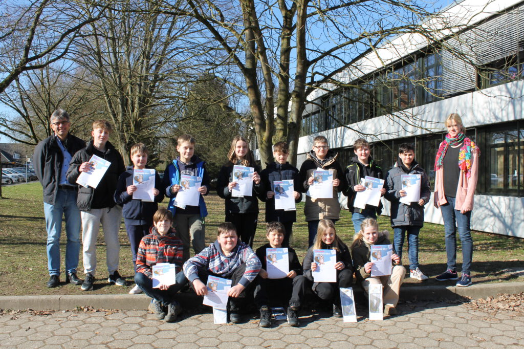 Am heutigen Mittwoch wurden nun die Klassenbesten aus dem sechsten Jahrgang geehrt, die allein oder in einem Team angetreten waren: Lucy Marie Meier und Laura Heidemann (6a), Jonathan Schneider und Michel Henke (6b), Felix Ottman und Steven Schäll sowie Amelie Enns und Leonard Knollmann (6c), Malte Möllers (6d), Lewis Mielke und Tim Luca Hermanns (6e) sowie Tyler Terence Hill und Mika Gärtner (6f). Über eine Urkunde und ein kleines Präsent durften sich auch Benjamin Pietsch (7e) und Sascha Kowal (8e) freuen, da sie in ihrem WP-Kurs jeweils die höchste Punktzahl erzielt hatten.