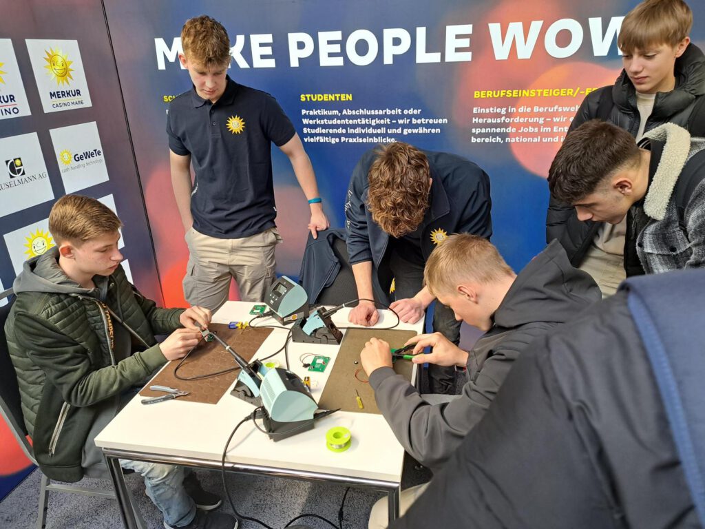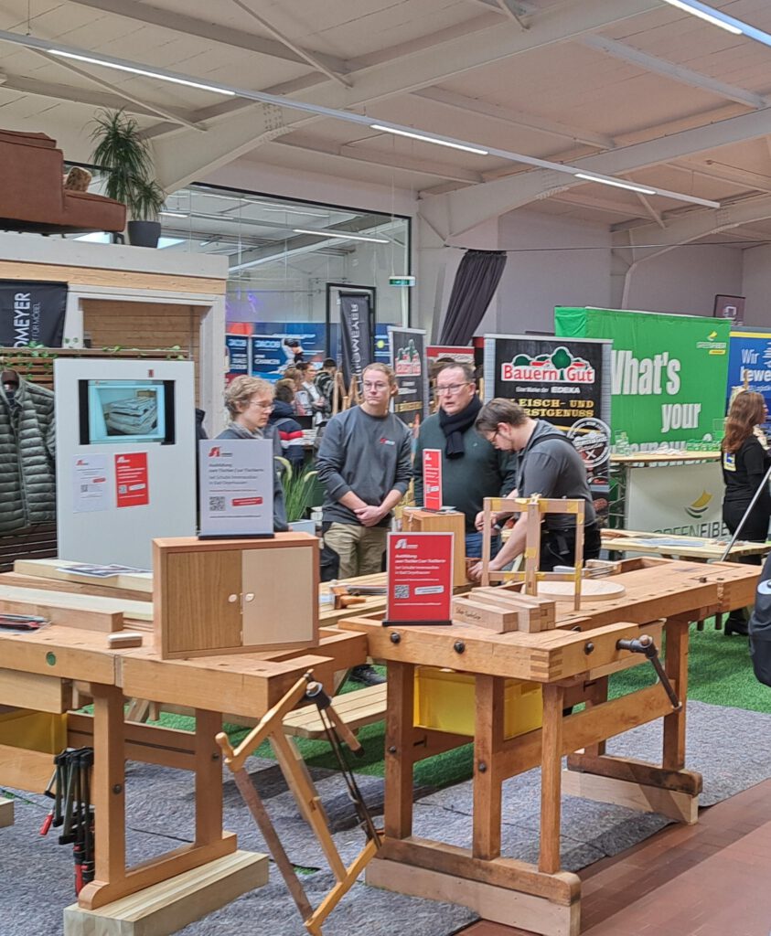 Der 9. Jahrgang besuchte am 1. März im Rahmen der Berufsorientierung die Ausbildungsmesse in Bad Oeynhausen. Das Team der „HIVE Zukunftswerkstatt“ setzt auf berufsnahe Praxisstände, die zum Ausprobieren einladen und den Jugendlichen die Möglichkeiten zum berufsbezogenen Handeln geben. In dreieinhalb Stunden konnten unsere SchülerInnen viele tolle Erfahrungen sammeln und sich auf 1.200 Quadratmetern durch verschiedene Berufsfelder probieren. Die Betriebe aus den Bereichen Handwerk, Gesundheit und Soziales, Technik und Verwaltung haben vom Baggersimulator, über Bodenverlegung, Metallbearbeitung, Löten, Tischlern und den Talente-Truck viele praktische Aufgaben für die jungen Besucher bereitgestellt. Ebenso konnten die Neuntklässler mit den Auszubildenden der Betriebe auf Augenhöhe ins Gespräch kommen, die direkt aus ihrem Berufsalltag berichteten.