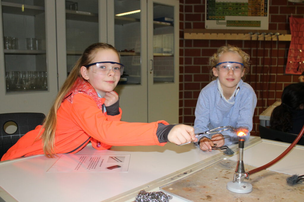 Die Physiker begaben sich ins Weltall: Sie setzten sich mit Flugkörpern auseinander und bauten dabei eigene Raketen aus Papier und Streichhölzern. Anschließend ließen sie diese fliegen und begutachteten mit erwartungsvoller Spannung ihre Flugfähigkeit. In farbenfrohen Experimenten wurde einige Räume weiter die Welt der Chemie erkundet. Hier durchliefen die Naturwissenschaftler in kleinen Teams verschiedene Stationen, an denen sie beispielsweise aus ganz gewöhnlichen Zutaten ,explosive Mischungen‘ erstellen oder erproben konnten, ob Eisen brennen kann.
