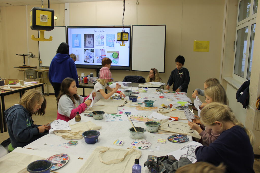 Während andere Teilnehmerinnen und Teilnehmer des Grundschultages in die digitale Welt eintauchten und an ihrem ersten eigenen Computerspiel tüftelten, kreierten die Künstler eigene Kunstwerke aus Taschen, die am Ende mit dem neu erworbenen Wissen über Farben und Drucktechniken gefüllt werden konnten.