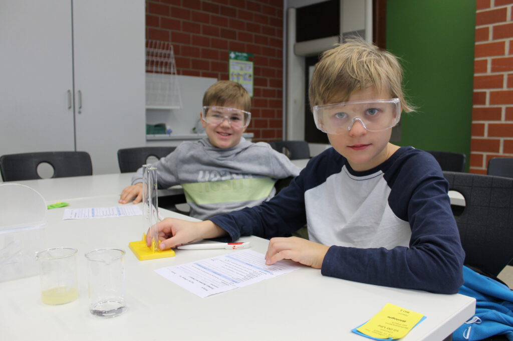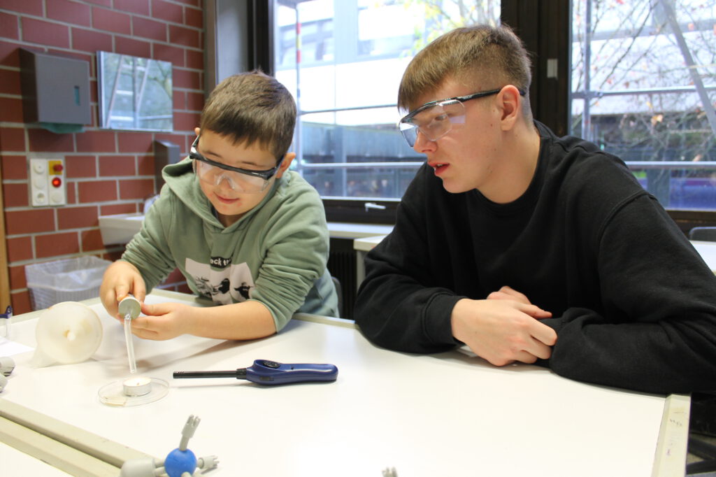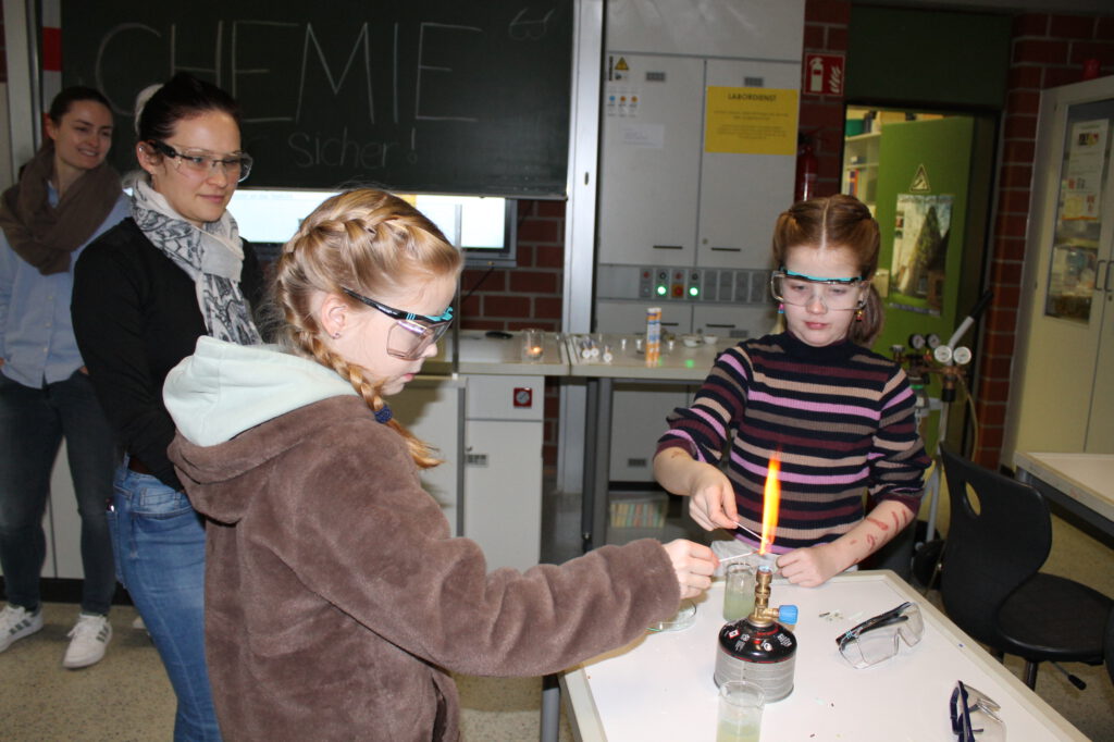 Daraufhin gab es für alle Besucher die Gelegenheit, den Unterricht an der Gesamtschule Hüllhorst hautnah mitzuerleben: Zum einen konnten die Viertklässler mit ihren Eltern in zwei halbstündigen Einheiten dem Unterricht des jetzigen fünften Jahrgangs beiwohnen. Zum anderen bestand die Möglichkeit, am „Schnupper-Unterricht“ mit einer reinen Grundschulkinder-Gruppe aktiv teilzunehmen. Hier gingen etwa die Biologen in einem Versuch mithilfe der Lugol’schen Lösung der Frage nach, ob in Limo Vitamin C enthalten ist. Die Chemiker leisteten detektivische Arbeit und wiesen mittels der Papierchromatographie Fälschungen auf Dokumenten nach. Des Weiteren stellten sie Mini-Feuerlöscher her, indem sie aus Multivitamin-Brausetabletten Kohlenstoffdioxid unter Zugabe von Wasser freisetzten. Auch in anderen Fächern wie zum Beispiel Informatik, Technik und Hauswirtschaft wurde fleißig getüftelt, gewerkelt und gebacken. Sprachinteressierte Grundschulkinder kamen ebenfalls auf ihre Kosten: In den Fächern Französisch und Spanisch konnten sie erste Erfahrungen mit der jeweiligen Fremdsprache sammeln und lernen, wie man sich in diesen Ländern begrüßt und vorstellt.