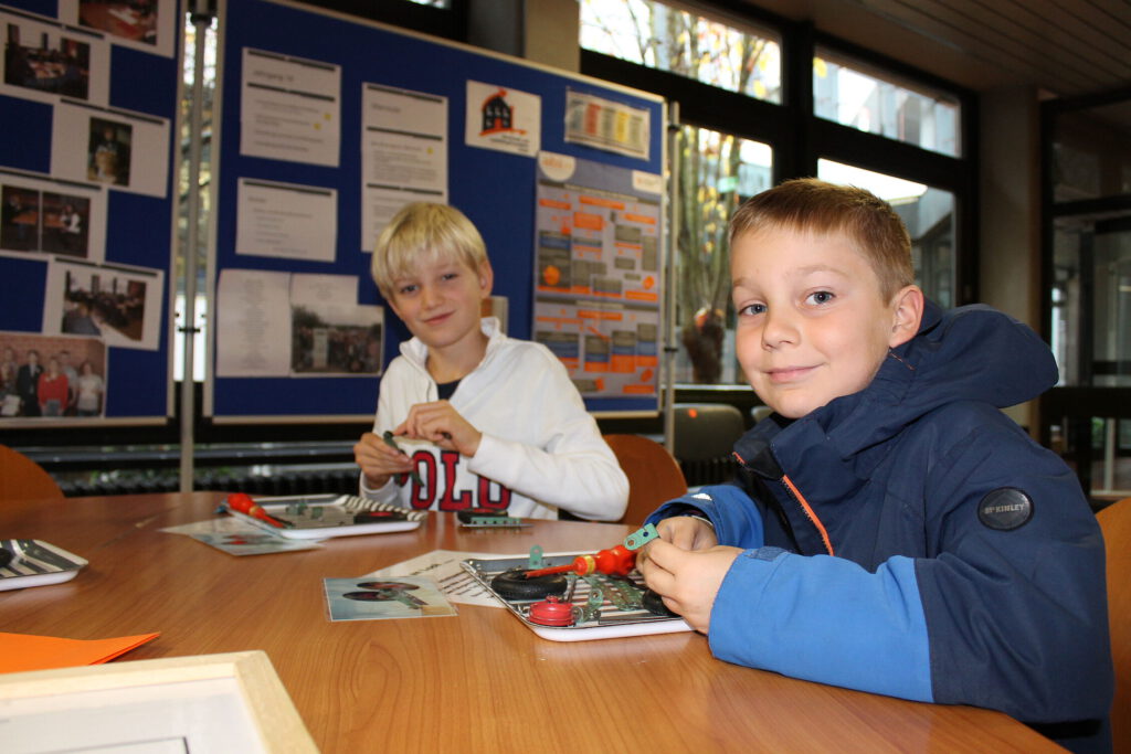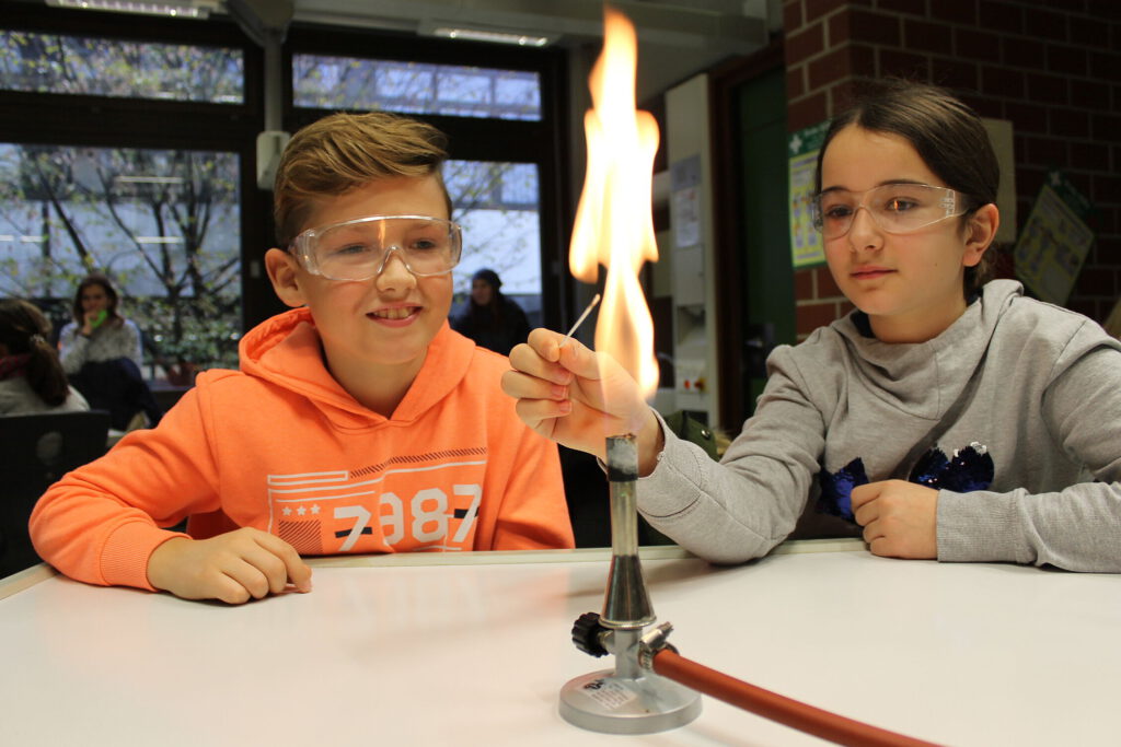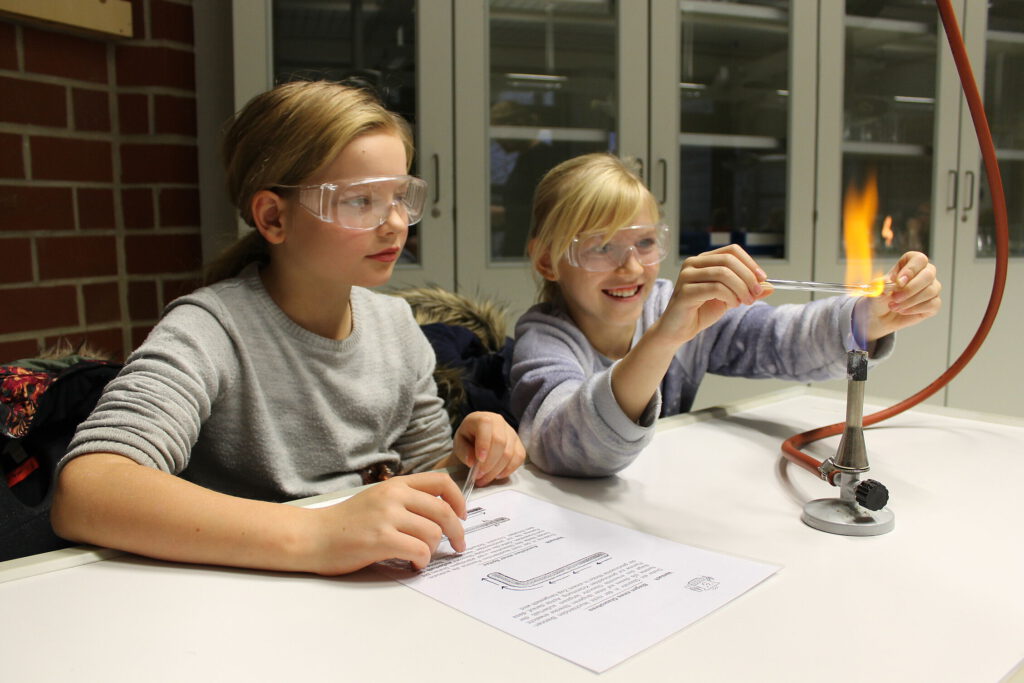 Daraufhin gab es für alle Besucher die Gelegenheit, den Unterricht an der Gesamtschule Hüllhorst hautnah mitzuerleben: Zum einen konnten die Viertklässler mit ihren Eltern in zwei halbstündigen Einheiten dem Unterricht des jetzigen fünften Jahrgangs beiwohnen. Zum anderen bestand die Möglichkeit, am „Schnupper-Unterricht“ mit einer reinen Grundschulkinder-Gruppe aktiv teilzunehmen. Hier führten die jungen Besucher beispielsweise im Fach Chemie erste Versuche mit dem Bunsenbrenner durch oder riskierten in den Biologieräumen einen Blick durch das Binokular. Auch in den Fächern Technik, Physik, Informatik und Hauswirtschaft wurde fleißig gewerkelt, experimentiert und gebacken.