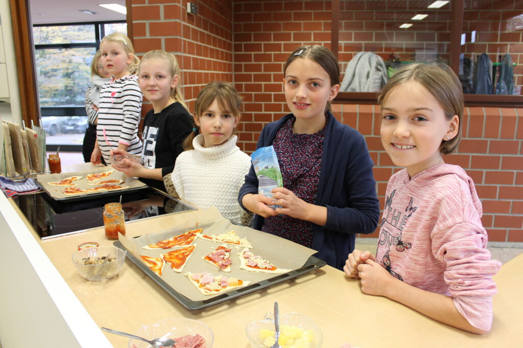 Adrianna, Alica, Daria, Frida und Mia (v.l.) belegen ihre Pizza im Hauswirtschaftsraum