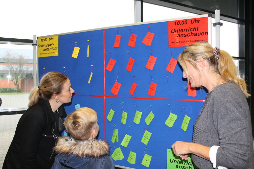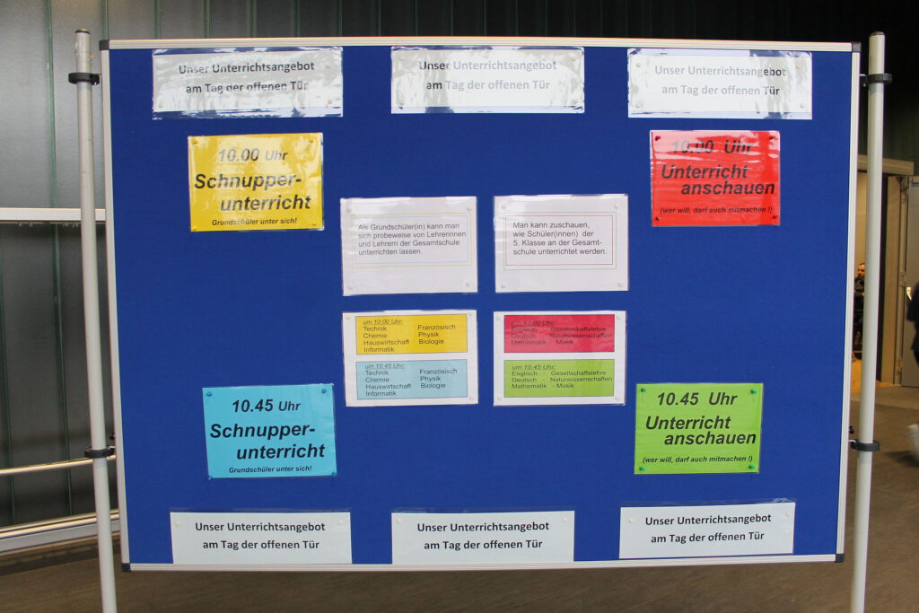 Einen allgemeinen Überblick verschafften kommentierte Führungen, die von den Schülerinnen und Schülern der Schülervertretung geleitet wurden. Zahlreiche betreute Informationsstände, die über die Besonderheiten des Schulangebots Auskunft gaben, luden in der Pausenhalle zum Verweilen und Nachfragen ein. Neben den Abteilungen für die Neuaufnahme und die Oberstufe präsentierten sich hier zum Beispiel das Förder-/Forder- und das Ergänzungsunterrichtskonzept, die MINT-Schwerpunktsetzung, Auslandskontakte, die Schulsozialarbeit, der weit gefächerte AG-Bereich sowie vielfältige andere Projektgruppen.
