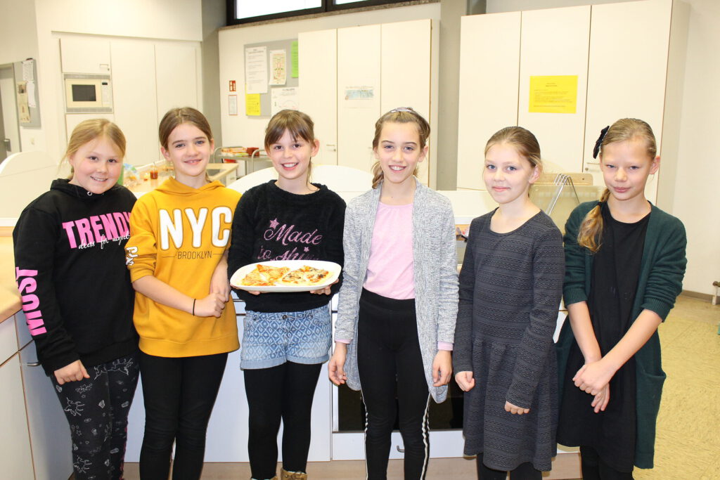 Milea, Lia, Sophia, Emilia, Jana und Leonie (v.l.) mit ihrer fertiggebackenen Pizza