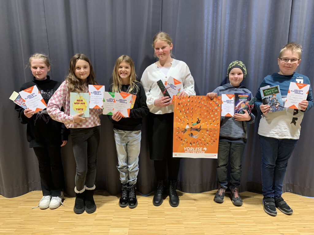 Lucie Hoffmeister (6b) heißt die Siegerin des diesjährigen Vorlesewettbewerbs der sechsten Klassen. Bei dem vom Börsenverein des Deutschen Buchhandels ausgerufenen Wettbewerb konnte sie sich gegen ihre fünf Mitstreiter Julian Kruckenbaum (6e, 2. Platz), Cleo N. Pfeiffer (6d, 3. Platz), Laura-Mareen Heidemann (6a), Emmely Fast (6c) und Moritz M. Herbst (6f) durchsetzen. Alle sechs sind begeisterte Leserinnen und Leser und konnten im Vorfeld bereits den Sieg innerhalb ihrer eigenen Klassen erringen. Am 15.12.22 stellten sie sich dann der Jury, bestehend aus dem stellvertretenden Schulleiter und Deutschlehrer Herrn Podszuweit, den Schülerinnen Lea Weiherich und Vivian Rührup aus dem Deutsch Leistungskurs der Q2 sowie Frau Böttger von der Buchhandlung Hüllhorst. Die Jury bewertete Lesetechnik, Interpretation und Textauswahl. In einem ersten Durchgang präsentierten die jungen Leserinnen und Leser einen eingeübten Textabschnitt aus einem selbstgewählten Buch. In einer zweiten Runde bestand die Herausforderung darin, einen unbekannten Textauszug vorzutragen, welcher dieses Jahr aus Gunnar Kunz‘ Jugendroman „Lagunenrauner“ stammte.