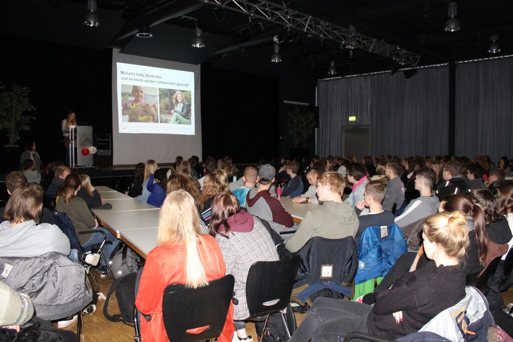 Zuvor fand für die Schülerinnen und Schüler der Oberstufe eine verpflichtende Infoveranstaltung zum Thema ,,Blutkrebs und Stammzellspende“ statt, bei der Judith Beckmann von der DKMS referierte. Außerdem war Alena Steinkamp, Lehrerin an der Gesamtschule Hüllhorst, eingeladen, die durch ihre Stammzellspende vor zehn Jahren einer an Blutkrebs erkrankten Amerikanerin ein neues Leben schenkte.