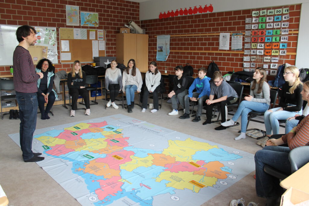 Projektkoordinator Sebastian Borchers und Teamkollegin Monika Filip boten dabei den zwölf Schülerinnen und Schülern, die am Austausch teilnehmen werden, eine einzigartige Möglichkeit, sich auf die Menschen, die Kultur und das Land Polen einzustimmen. Das Programm der Moderatoren beinhaltete unter anderem eine begehbare Landkarte, auf der ein geographischer Vergleich zwischen Polen und Deutschland stattfand. Mit im Gepäck hatten sie auch einen Souvenir-Reisekoffer mit typischen Souvenirs von Städten und Regionen, um den Schülern das Gefühl zu geben, bereits in Polen zu sein.