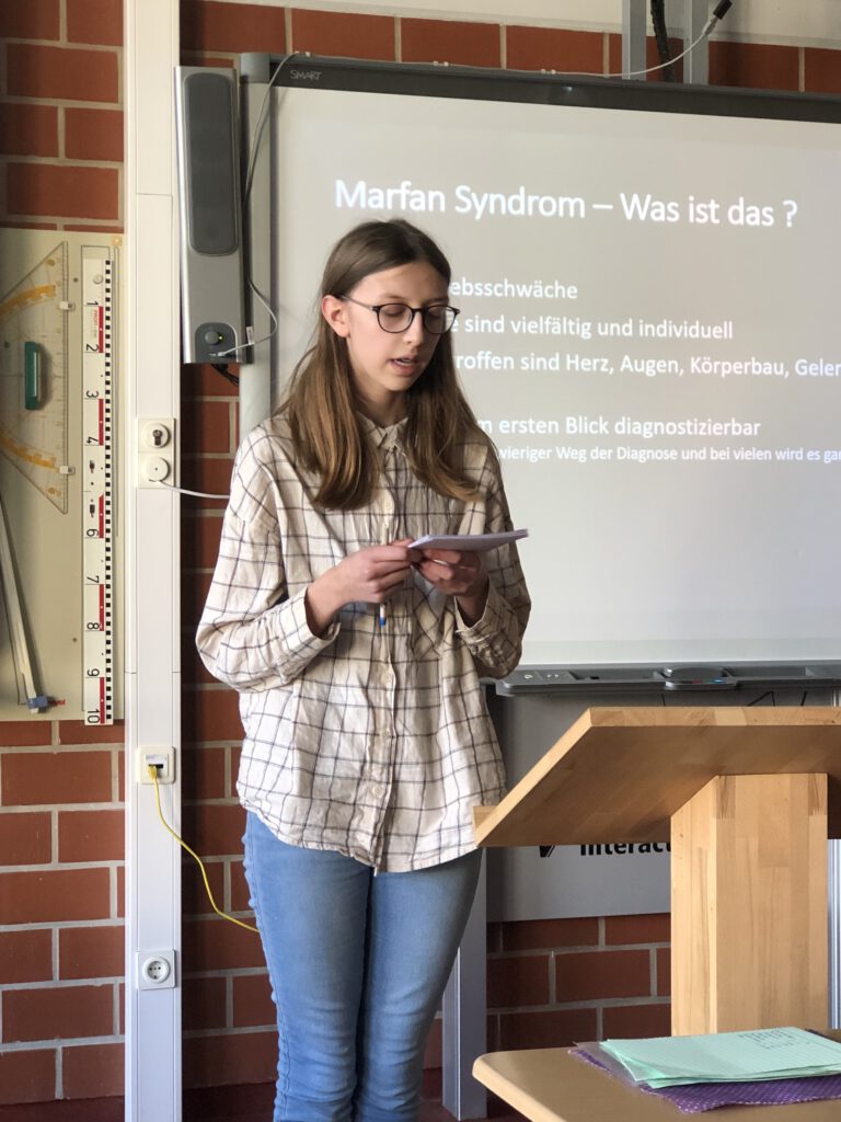 Präsentation zum Marfan-Syndrom vorbereitet hatte. Das Marfan-Syndrom ist eine Erbkrankheit, die zwar selten auftritt, für die Betroffenen allerdings gravierende Folgen hat (z. B. schlechteres