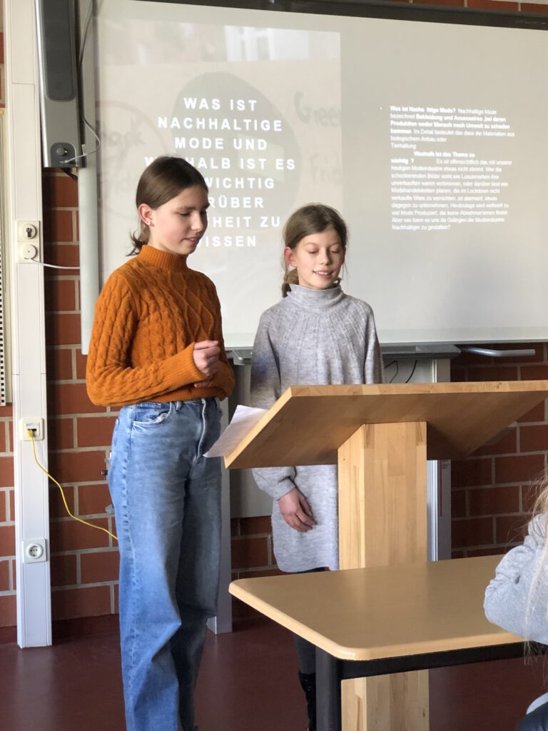 Sehvermögen). Sichtbares Kennzeichen sind besonders lange Extremitäten. Als Betroffene konnte Josie dann auch besonders anschaulich die Folgen dieser Krankheit für den Alltag beschreiben. Zum Abschluss der diesjährigen Präsentation hielten Daria Wolkow und Lea Reiss einen Vortrag über nachhaltige Mode. Sie erklärten, was man unter nachhaltiger Mode versteht und warum gerade der Bereich „Fast Fashion“ ein großes Problem für die Umwelt darstellt. Außerdem zeigten sie anhand eines selbst genähten Mäppchens noch, wie man alte Kleidung weiterverwenden kann.