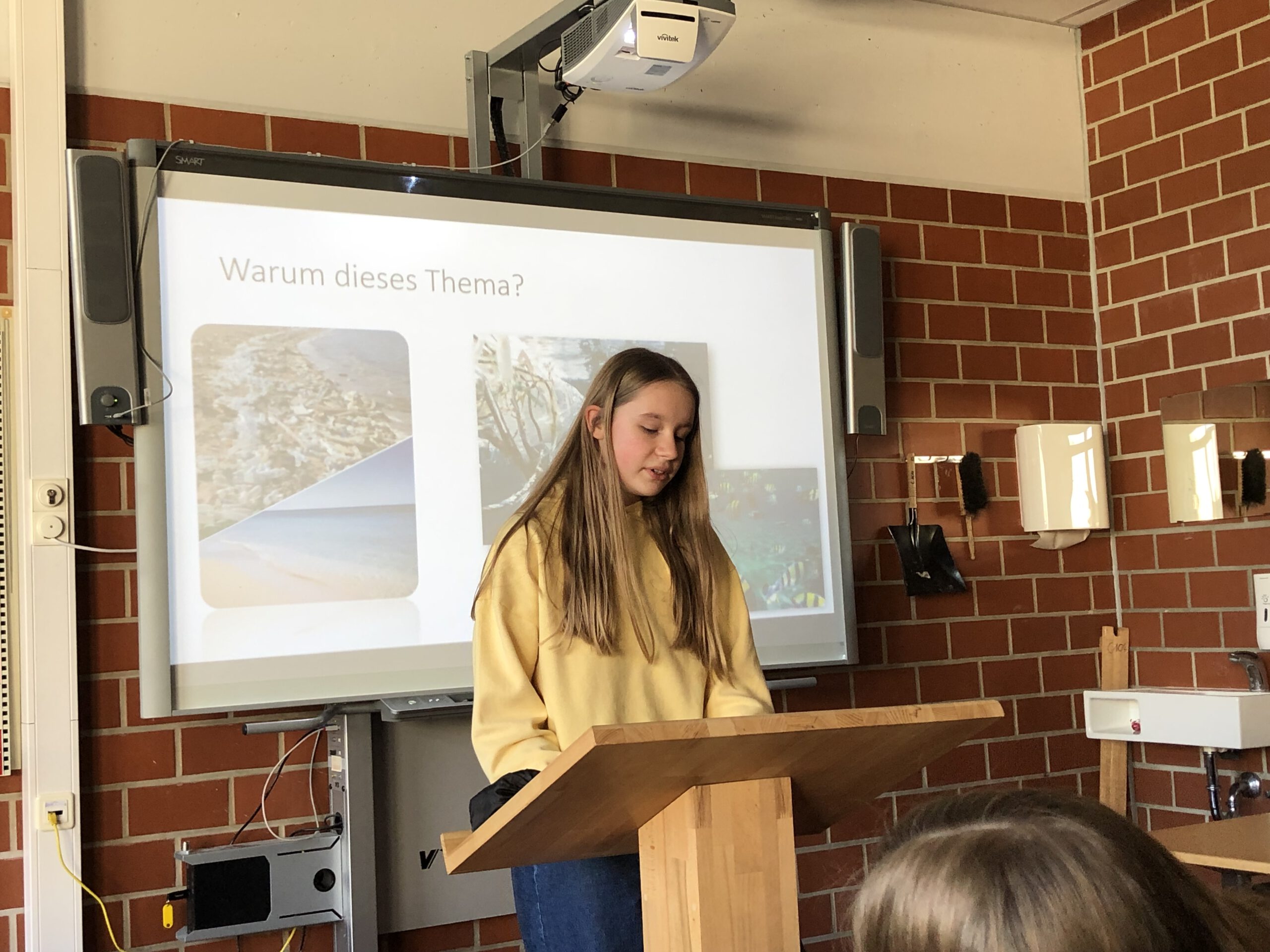 Am Mittwoch, den 08. Februar 2023 fand dann für die vier teilnehmenden Schülerinnen die Präsentation der Ergebnisse statt. Eltern und Freunde waren zum Zuhören gekommen. Den Beginn machte Maria Wenge, die sich mit dem Thema „nachhaltiges Leben“ beschäftigt hatte. Mit Hilfe einer sehr gut gestalteten Power-Point-Präsentation konnte sie gute Tipps geben, wie man den Lebensalltag insgesamt nachhaltiger bewältigen kann. Es folgte Josie Voß, die eine sehr interessante