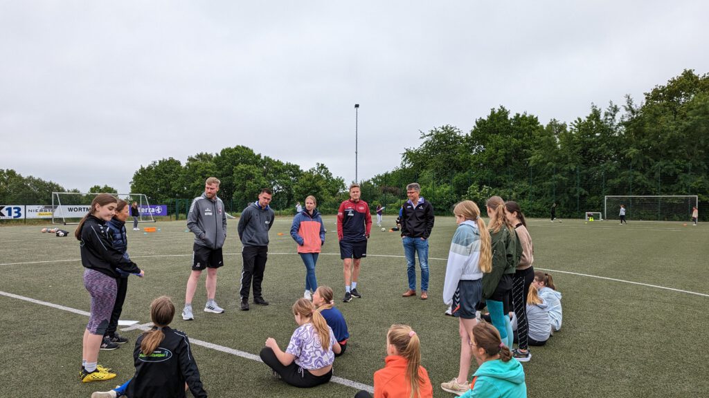 Ein besonderes Highlight war die Fragerunde mit den Trainern. Die Mädchen hatten die Gelegenheit, Fragen zu stellen und wertvolle Einblicke in den Trainingsalltag und die Herausforderungen des Fußballs zu erhalten. Die Trainer, darunter auch Alicia Fricke, eine Spielerin aus der Damenmannschaft des SV Hüllhorst-Oberbauerschaft, und Susanne Siebering, Trainerin des SV Schnathorst, waren beeindruckt von der Begeisterung und dem Engagement der jungen Fußballerinnen.