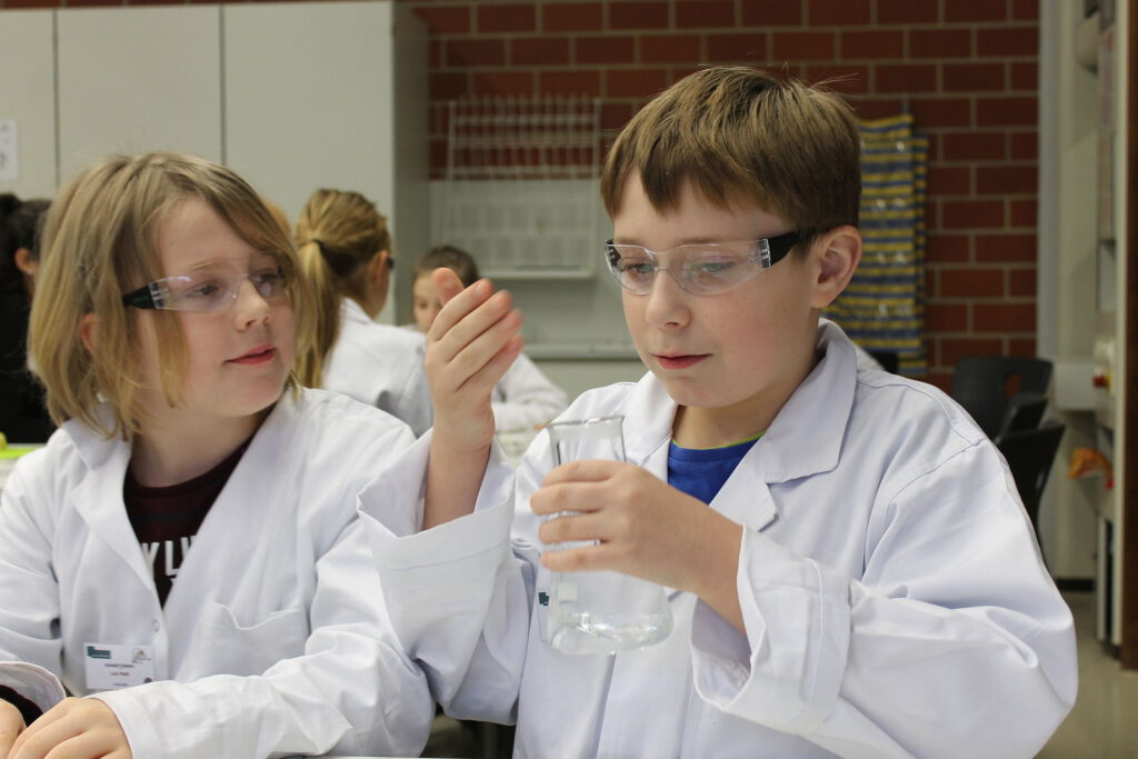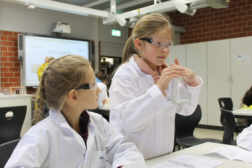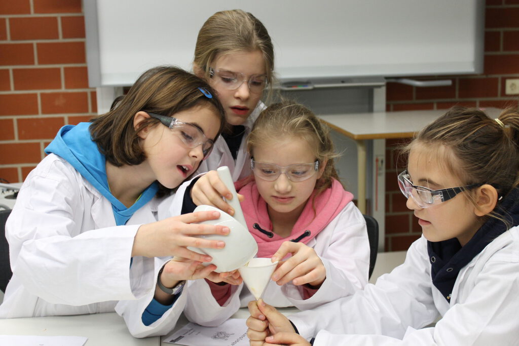 Der Einladung sind alle Grundschulen der Gemeinde Hüllhorst gefolgt, so dass an vier Tagen, organisiert durch die Lehrkräfte Noreen Meier und Kai Hallau, 145 Schülerinnen und Schüler die verschiedenen chemischen Experimente erproben konnten. Durch die tatkräftige Unterstützung von Schülerinnen und Schülern der Gesamtschule Hüllhorst aus den Jahrgängen 10 und Q2, die die einzelnen Stationen betreuten, wurde die umfassende Veranstaltung zu einem vollen Erfolg. Die Grundschüler waren mit großer Begeisterung bei den Versuchen mit Zitronen, Essigsäure und Rotkohlsaft dabei. Ermöglicht wurde diese Veranstaltung durch die monetäre Unterstützung der Gelsenwasser-Stiftung. So konnten Kittel, Schutzbrillen und Versuchsmaterial angeschafft werden.
