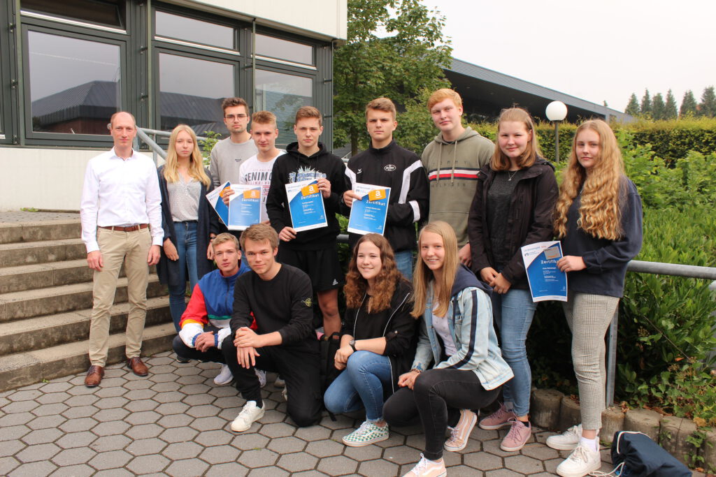Zwischen den Siegern gab es ein hartes „Kopf-an-Kopf-Rennen“. Sie lagen nur wenige Euro auseinander. Den dritten Platz mit einem fiktiven Guthaben von 50.585 Euro und somit einem Gewinn von 1,2 % belegte die Gruppe mit Patrick Babilon, Niklas Blaue, Thorben Habbe, Fynn Kahler und Lennart Maschmeier. Sie erhielten von der Volksbank je einen Gutschein von 20 Euro. Den zweiten Platz holten sich mit 50.639 Euro (+1,3%) Ben Hageböke, Johannes Nierste, Hannah Ober-Hongsermeier und Mauritz Schmidt. Sie erhielten jeweils einen Gutschein von 50 Euro. Strahlende Sieger mit einem Guthaben von 50.900 Euro (+1,8%) und einem Gutschein von je 100 Euro wurden Sarah Niedermeier, Friederike Rautenberg, Nina Wiesner und Ylvie Wittemeyer.