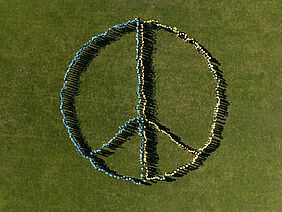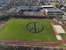 Weit über 500 Schülerinnen, Schüler, Lehrerinnen und Lehrer haben am Donnerstag ein weithin sichtbares Zeichen für den Frieden gesetzt. In der Mittagspause versammelten sie sich auf dem Sportplatz der Gesamtschule, um sich für die Menschlichkeit zu solidarisieren. Organisiert wurde die Aktion von der Schülervertretung der Gesamtschule Hüllhorst. Schülersprecherin Alina Kirchhoff dazu: „Uns war es wichtig, dass die Schülerinnen und Schüler freiwillig an der Aktion teilnehmen konnten, weshalb wir sie auch außerhalb des regulären Unterrichts durchgeführt haben.“ Einen reibungslosen Ablauf garantierten die übrigen Mitglieder der SV, die die Teilnehmerinnen und Teilnehmer mit gelben und blauen Zetteln in den Farben der ukrainischen Flagge ausstatteten und sie in dem vorher abgesteckten Friedenszeichen auf dem Sportplatz aufstellten. Für die Aufnahmen sorgten Tilke Quellhorst und Marek Wohlfarth von der Filmhütte Hüllhorst. „Das sind schon beeindruckende Bilder“, so Eren Karayol, „vor allem, wenn man bedenkt, dass viele Schülerinnen und Schüler nicht teilnehmen konnten, da sie mit dem Bus nach Hause mussten. Einige sind aber trotzdem geblieben und haben sich von den Eltern abholen lassen, weil es ihnen einfach wichtig war, dabei zu sein und so ihre Meinung zum Ausdruck bringen zu können.“ Im Vorfeld hatten sich die Schülerinnen und Schüler viele Gedanken gemacht, wie sie ihre Solidarität bekunden und ihren Wunsch nach Frieden und Menschlichkeit nach außen zeigen könnten. Natürlich gab es auch Überlegungen hinsichtlich einer Demonstration oder einer Mahnwache. „Uns war die Aktion aber so wichtig, dass wir auf keinen Fall wollten, dass es anschließend heißt, dass einige Schülerinnen und Schüler nur mitgemacht haben, damit ihr Unterricht entfällt. Deswegen haben wir uns für diese Form des stillen Protests entschieden“, erzählt der stellvertretende Schülersprecher Kelvin Kirchhoff aus dem 11. Jahrgang. Abgeschlossen werden soll diese Woche mit einer Schweigeminute, in der die Schulgemeinschaft aller bisherigen Opfer dieses Krieges gedenken möchte.