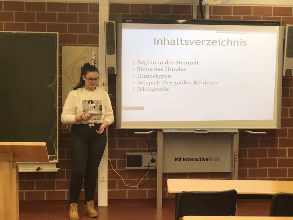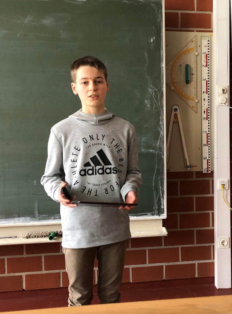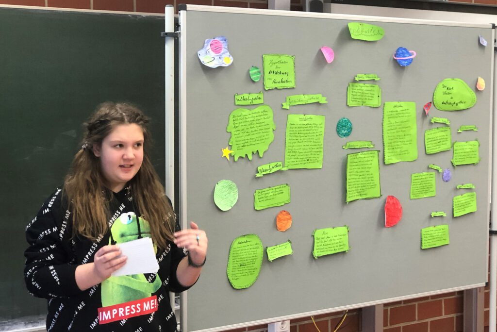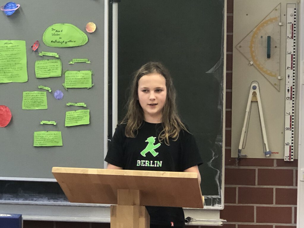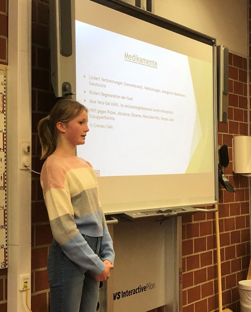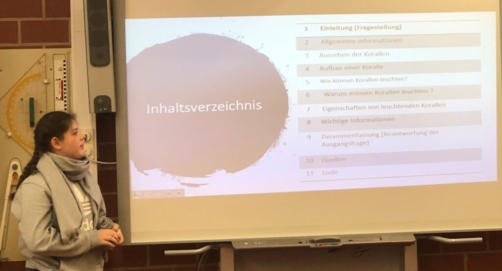 Den Auftakt machte am 12.02.2020 Imke Nordieker aus der 7a Gingko mit dem Thema ,,Aloe Vera: Wofür wird sie genutzt?“ Anschaulich erklärte sie die Besonderheiten der Pflanze und ihren Einsatz in kosmetischen und medizinischen Produkten. Milina Heidebrecht aus der 7a Gingko hielt anschließend einen Vortrag zum Thema ,,Warum leuchten einige Korallen?“. Sie verdeutlichte gut verständlich den Aufbau von Korallen und die chemisch-biologischen Zusammenhänge, die dafür verantwortlich sind, dass einige Korallen leuchten. Nach zwei biologischen Vorträgen ging es dann thematisch in den Weltraum: Merit Meier aus der 7b Kastanie hatte sich mit der Frage beschäftigt, warum es Krater auf dem Mond gibt. Mithilfe einer aufwändig gestalteten Stellwand stellte sie verschiedene Theorien vor, die das Vorhandensein dieser Krater erklären. Es folgte Isa Riechmann aus der 7c Marone mit dem Thema ,,Vom Wolf zum Hund“. Hier lag der Schwerpunkt auf der ausführlichen Vorstellung der verschiedenen Hundetypen, die durch Züchtung in den letzten Jahrhunderten entstanden sind. Eine besondere Präsentation gab es dann noch zum Abschluss: Jacob Radke aus der 7c Marone hatte ein spannendes Fantasy-Märchen geschrieben und zu dieser Geschichte eigene Musik komponiert. Eine Aufnahme dieses Musikstücks stellte er im Rahmen der Präsentation vor.
