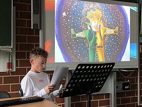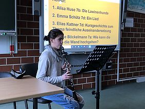 Den Anfang machte Alisa Huse aus der 7b mit einem Vortrag zum Thema „Lawinenhunde“. Sehr anschaulich erklärte sie, wie Lawinen entstehen, welche Voraussetzungen Lawinenhunde vorweisen müssen und wie Lawinenhunde ausgebildet werden. Anschließend wurde es musikalisch: Emma Schütz aus der 7d spielte ein selbstkomponiertes Musikstück für die Klarinette vor. Da dies nicht ihr einziges selbst komponiertes Lied bleiben soll, nannte sie es treffenderweise Episode I. Die nächste Präsentation stammte von Elias Kattner aus der 7d. Er hatte eine spannende Fantasy-Kurzgeschichte verfasst, die vom Kampf „Gut“ gegen „Böse“ handelte. Der besondere Clou dabei: Elias hatte die Geschichte mit selbstgemalten Bildern illustriert. Den Abschluss der Veranstaltung machte Luise Böckelmann aus der 7a. Auf der Rückfahrt von der Schule im Schulbus hatte sie eine Fliege beobachtet und sich gefragt, wie es die Fliege schaffe, die Wand hochzuklettern, ohne herunterzufallen. Damit sich die Zuschauer vorstellen konnten, wie die Fliege dies schafft, hatte Luise kleine Experimente vorbereitet, mit denen sie die Besonderheiten der Fliegenbeine und die Wirkung der Adhäsionskraft erklären konnte.