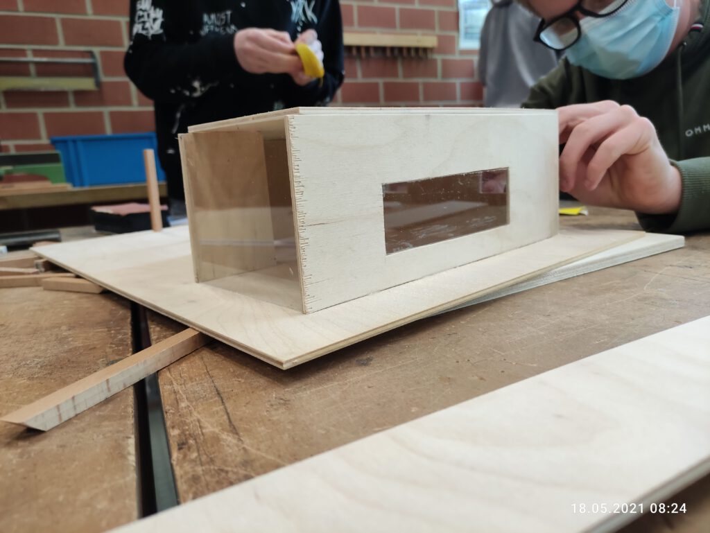 Der Klimaschutz liegt uns allen am Herzen. Deswegen hat sich der WP 10 Kurs Technik mit dem Lehrer Herr Conti im Rahmen eines Projektes Gedanken darüber gemacht, wie man Häuser möglichst energieeffizient bauen könnte. Dazu sind Baustoffe nötig, die eine gute Wärmedämmung der Gebäudehülle bewirken. Also konstruierten die Schüler Jona Brosend, Benedict Gayk und Ben Tjelle Kern ein Modell-Haus aus dem Naturbaustoff Holz und setzten ihre kreativen Ideen zu einem energieeffizienten Miniatur-Modell-Haus nach ihren Vorstellungen um.